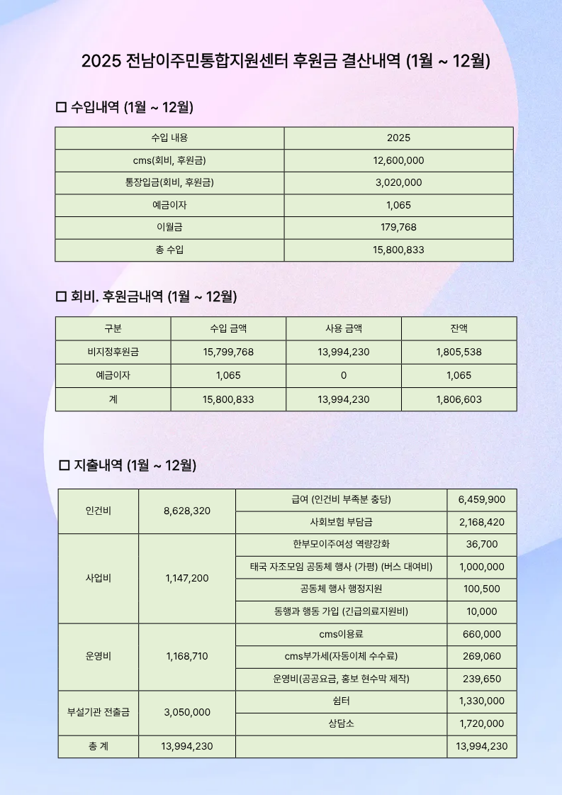 2025년 전남이주민통합지원센터 후원금 결산내역